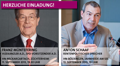 Zwei Abschlussveranstaltungen im Rahmen des Wahlkampfes finden in den letzten beiden Wochen vor der Wahl statt. Was macht der demografischen Wandel mit unserem Land, wie muss die Politik darauf reagieren? Am Mittwoch, den 11. September 2013, um 19:30 Uhr wird Franz Müntefering in der Gaststätte Züchterheim (Im Widmannstal 32, Heilbronn-Neckargartach) zu Gast bei Josip Juratovic sein. Der frühere SPD-Parteivorsitzende und Vizekanzler wird zum Thema „Weniger, älter, bunter: Generationen im Wandel“ sprechen.